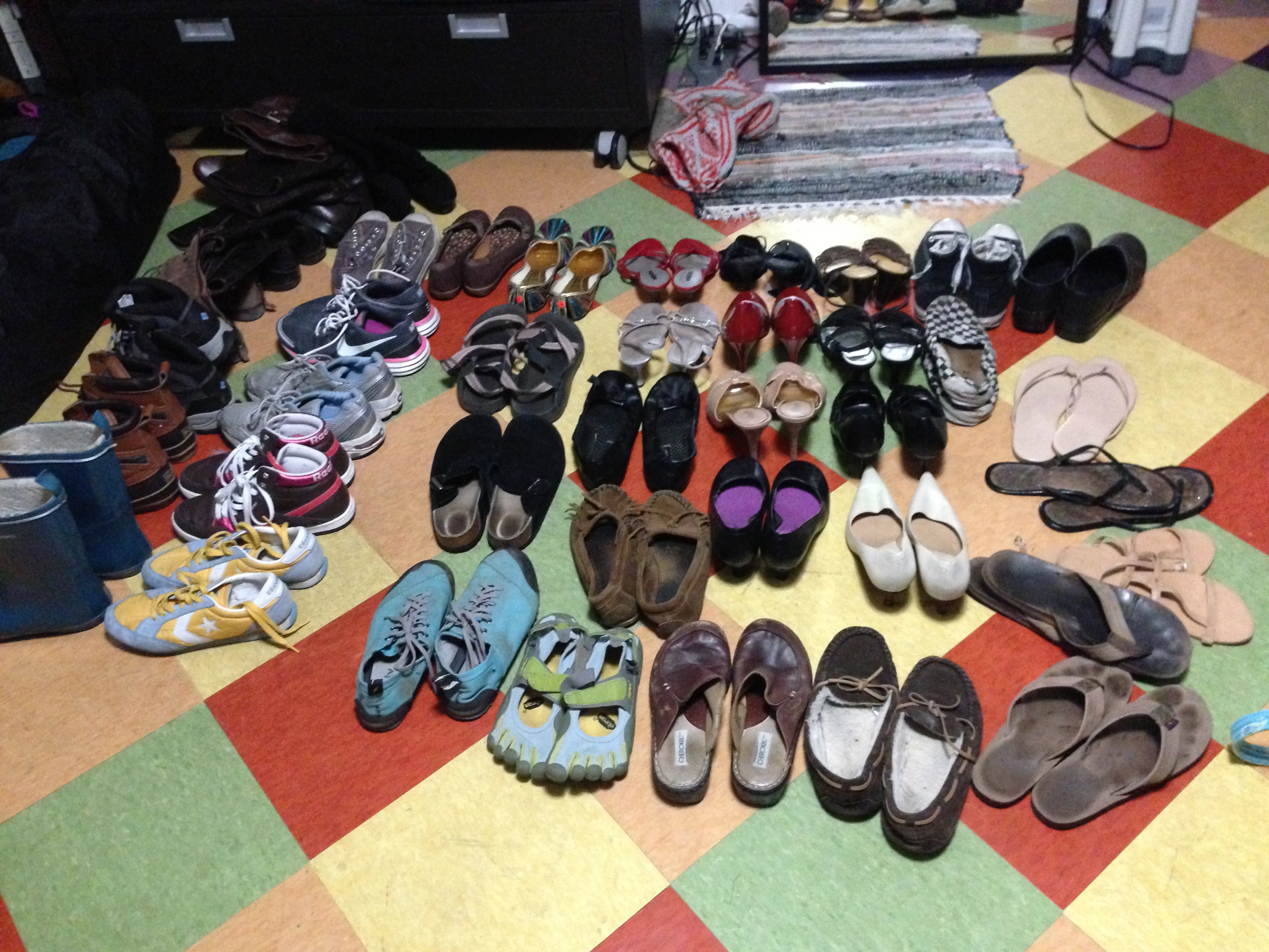 2. I say keep the Danskos, any climbing shoes, chocos, rainbows unless the soles have holes, black and white heels (possible weddings you might attend), then pick a few more that you love..The rest NAKED LADIES PARTAY!! xoxo
