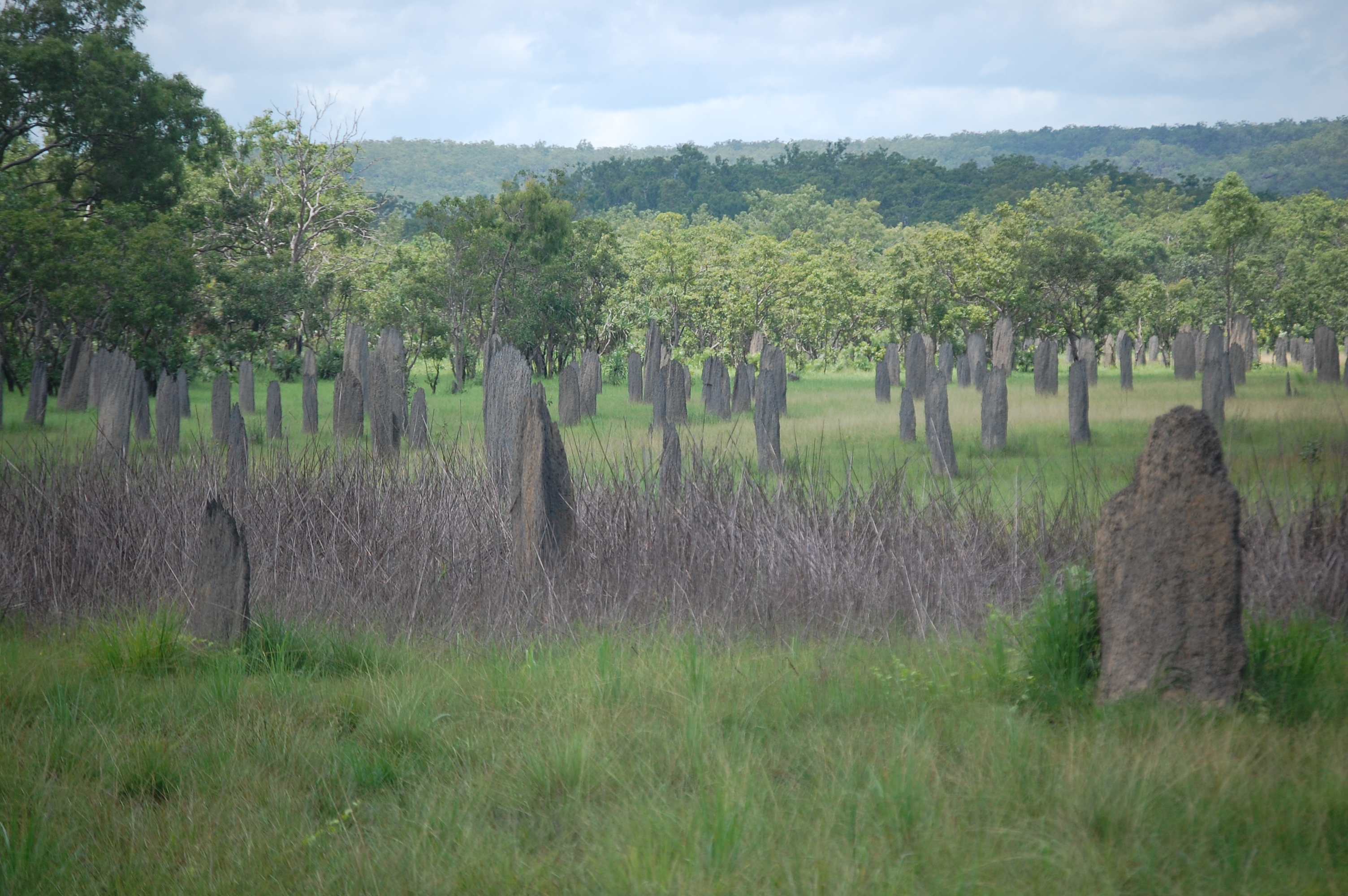- magnetic termite mounds. these termite mounds are built by thousands of termites with a north-south orientation to control the temperature inside the mounds. they just know which way is north. i wish i had that great of an internal compass. they cover the field like massive gravestones thin as pancakes.