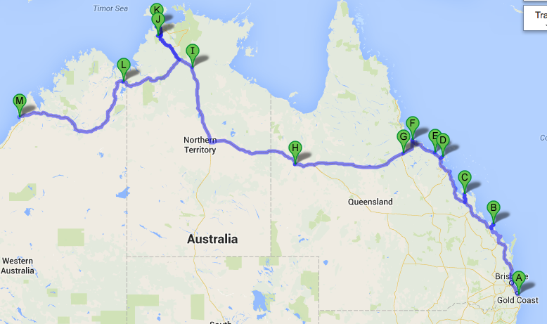 after a few hundred kilometers, a sleepless night in kununurra where i woke up at 2am to ensure a timely social media post for a client, and a quick dip in the closed caravan park pool, we were on our way to broome (green pin labeled M)!