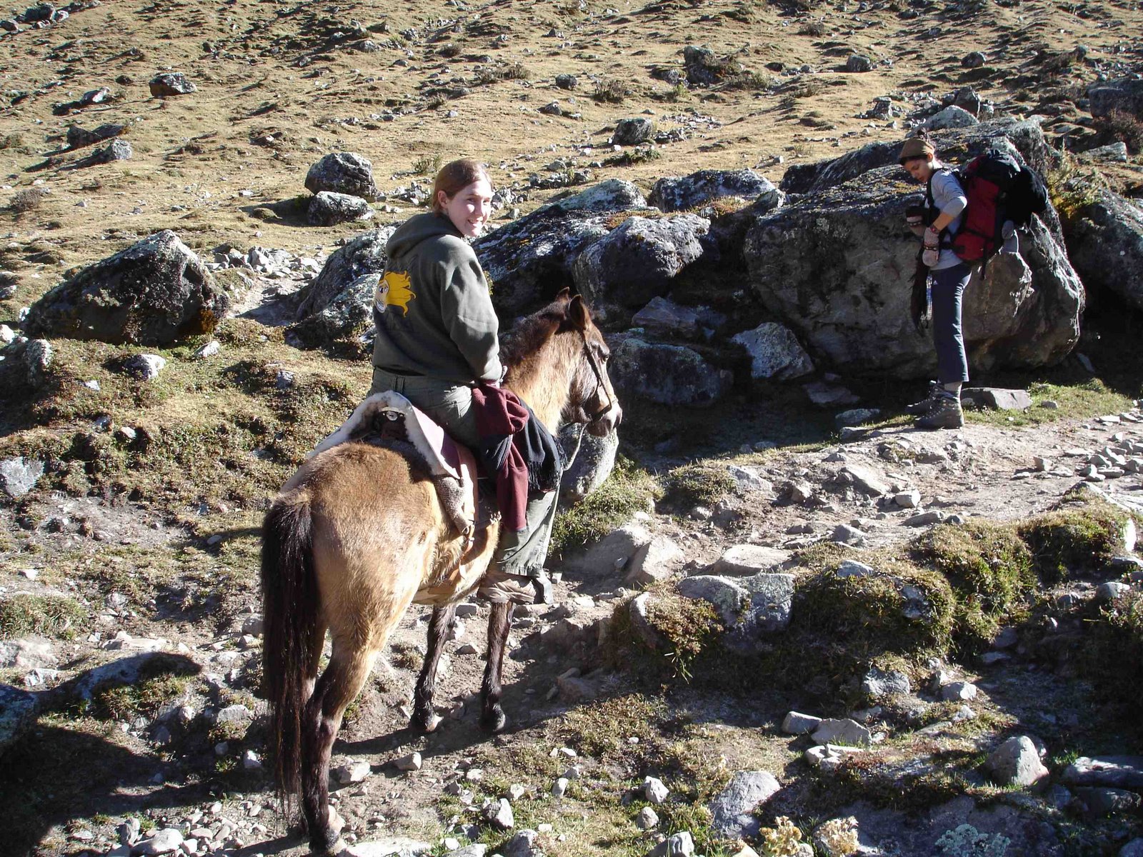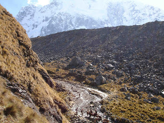 i wake up feeling not so good. i try to eat. only bread and celery tea. i got to love celery tea (apparently good for the stomach). i packed everything up. we began to hike the hardest part of the trek….i couldn’t make it in my condition, so good old herbie found me a horse for 60 soles (20 dollars) to ride up to the peak. it was amazing. my dream come true. all alone, i rode my horse up the mountains. i took pictures. i stopped and rested with my horse. i could not have asked for a more wonderful experience. i was feeling a little bit better, but the altitude was increasing. by mid-day we (the rest of the group, who sadly had to hike instead of take a horse) made it to the top of Mt. Salkantay with an altitude of 4600m or about 14,000 ft. it was breathtaking. literally, i could not breathe. haha. no, it was beautiful. after soaking in the sights and hard work, we started the descent. through grassy, muddy, rocky lands that reminded us all of ireland for some reason, or rather, what we think ireland looks like. i was feeling weak. i actually hurt my elbow because i was flailing my body so much with each downward step. THEN we had lunch. i ate spoonfuls of rice that ted sweetly placed on my spoon. with each spoonful of rice, i magically become better. it could have also been the decreasing altitude, but let’s say it was the rice. i hiked slow and strong down to our second campsite, a beautiful site next to a flowing river. i finally enjoyed dinner. and the company of my group. everyone finally got to know who sara schneider is. although the mosquitos increased, the temperature got warmer. the sunned faces began to appear. we all went to bed happy and ready to descend more in the morning.