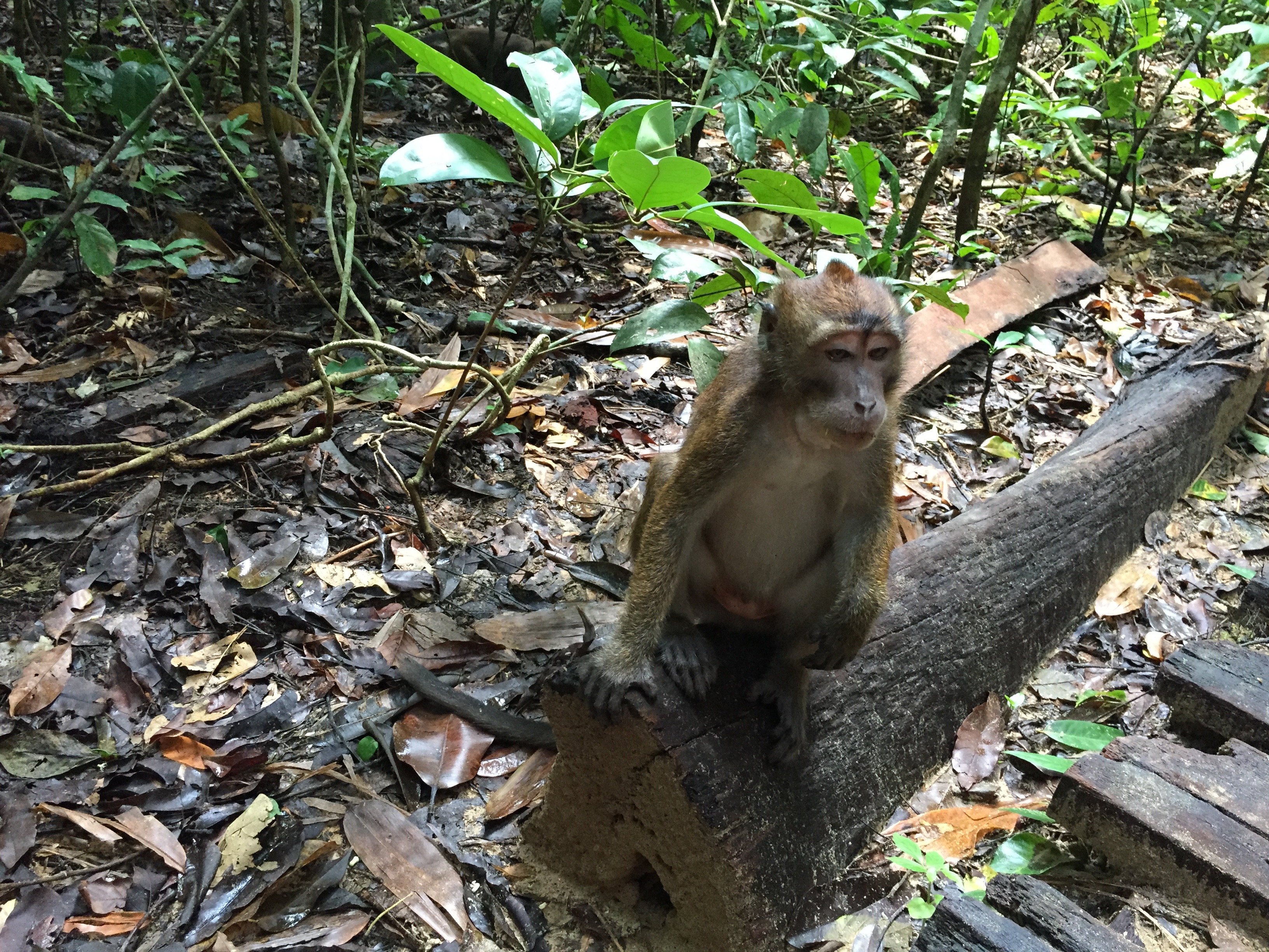 we waited for our turn and then set out across the ocean waves. after we docked on shore, we climbed out onto the sand and walked the wooden, monkey-streaked path to the tour entry point.